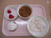 初日の献立は、春野菜カレー、麦ご飯、ハムエッグ、いちごでした。